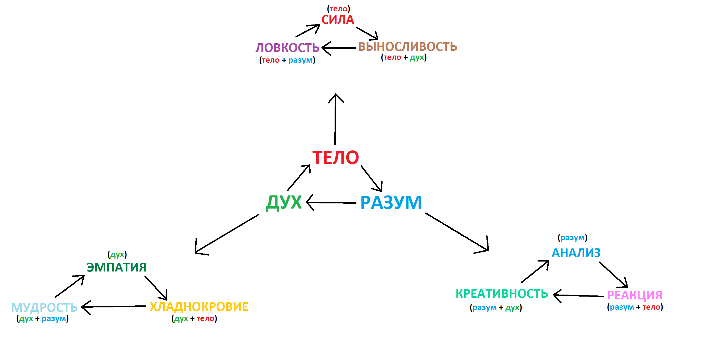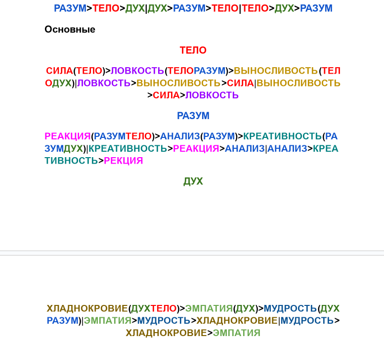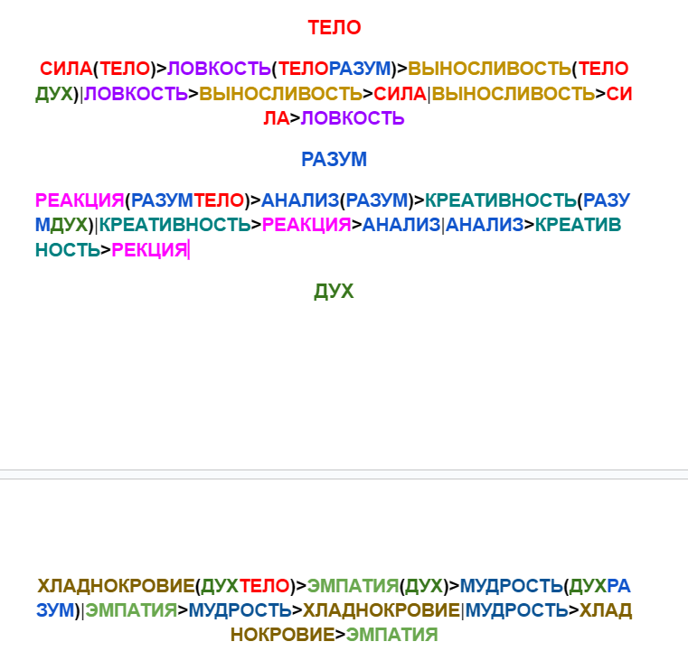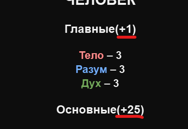 Каждый персонаж будет иметь три большие характеристики: Тело, Разум, Дух. Они означают, сколько полных десятков средних характеристик ваш персонаж может поиметь и варьируются от 1 до 20. Чаще всего, это определяется расой персонажа. Так же, каждая из трёх больших характеристик является "Шкалой ХП" вашего персонажа. Эту механику я опишу позднее, когда первые игроки столкнутся с этими трудностями напрямую.