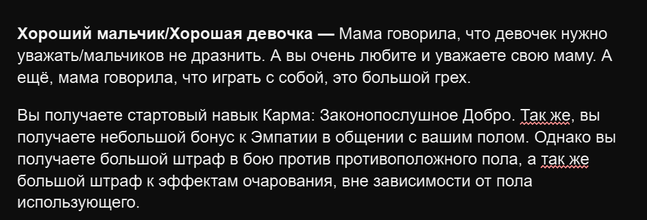 Какая Империя? Я из..! - Вы любите свою родину. Не ту, что зовут Старой Империей, а свою малую родину, откуда бы вы не были. Вас даже можно назвать патриотом, ведь как можно не любить это прекрасное место, которое взрастило вас и таких же достойных людей как и вы. Вот только как можно любить всю ту мразь, которая мешает вашей родине стать настолько великой, насколько она того заслуживает? Вы получаете стартовый навык Карма:Хаотически Злой. Однако вы получаете огромный бонус к Эмпатии для персонажей относящихся к той же этнической группе людей, что и вы. Так же вы получаете штраф в общении и уникальную возможность безосновательно нарываться на конфликт с любым представителем другой расы и этнической группы.