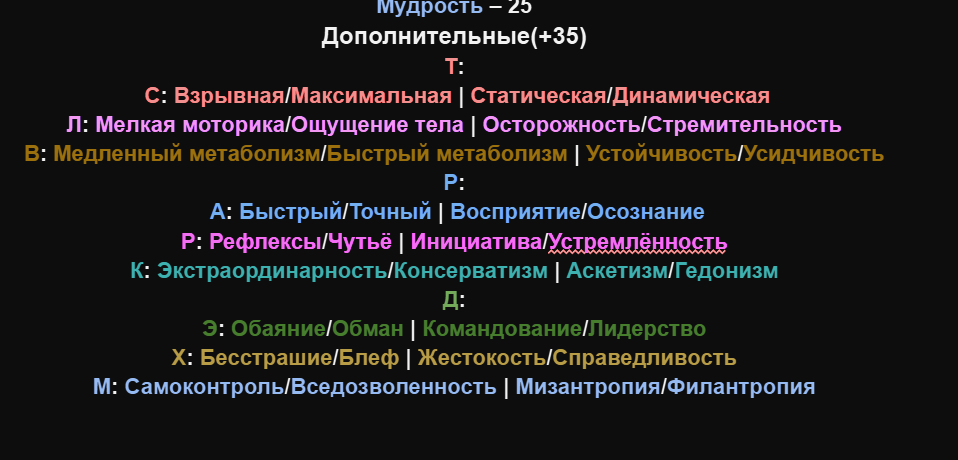 >>1601794 Три категории статов Главные, основные, дополнительные. Если в расах рядом со статами (+n), это столько, сколько можно докинуть к статам. Но есть правило, нельзя основного стата иметь больше, чем главного10. Главные 3.5 = потолоко основного 35. Дополнительный может быть = (Главный1.5)*10.