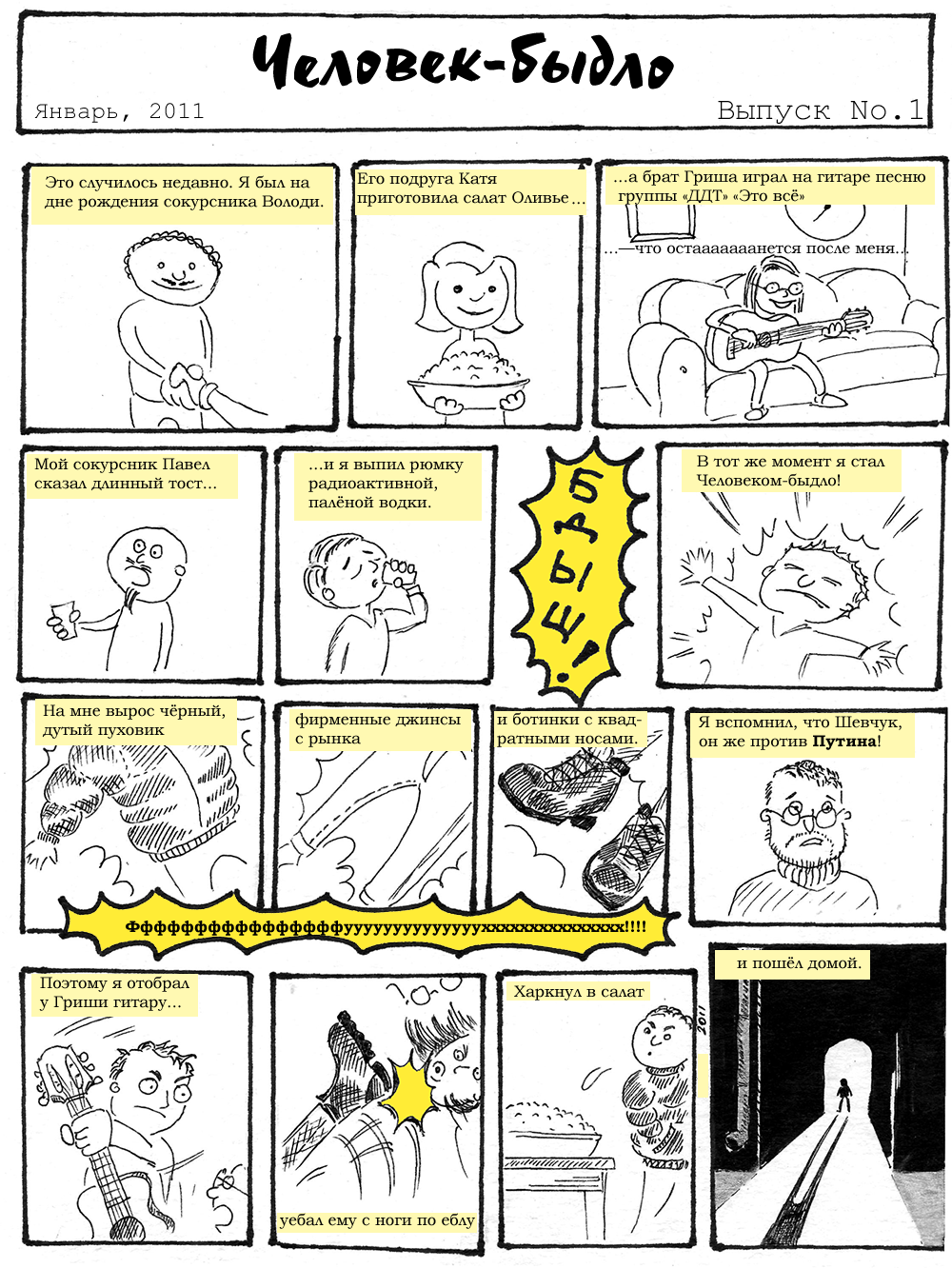 Примерно в 2016 году анон кидал сюда комикс про крокодильчика-альтруиста. Правда, он загнулся после двух с половиной выпусков. В начале 2012 сюда наведывался какой-то тип (очевидно, из ЖЖ) с довольно амбициозными планами запилить комикс о России недалёкого будущего, скатившуюся в ура-патриотизм, описанный Константином Асмоловым в статье о жёлтом мифе. К сожалению, в треде было лишь общее описание сюжета и действующих лиц (наивный нашист, нытик и диванный революционер, срисованный со Шмуклера), а также несколько набросоков с последним. Я так и не смог выйти на автора, а после крымнаша комикс потерял возможную актуальность.