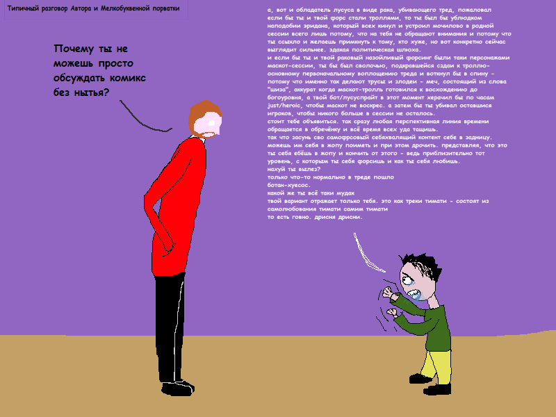 Гамзиидруже тут же перекорёжило. Он так сильно хотел, чтобы окружающего его мужчины отыгрывали ему троллесамок из комикса, что готов был пойти на многое ради этого. На многое. С другой стороны, пускай ему и хотелось чтобы Автор отыграл Кондесс, но включить цундере режим и повредничать обязательно нужно. Но кто будет отыгрывать тебе троллесамок, если ты вредничаешь? То-то и оно. ГД разрывало от ебучей двоственности. И хочется и колется, ебучий блять виноград висит. Надо показать себя сильным и независимым не сильно-то и хотелось этот текстовый смут устраивать. - Да иди в пень каороче. – Сказал ГД, отводя взгляд внизу смущенно - Друже, я не хотел ничего плохого. – Сказал Автор ГД рвало от ебучей и двойственностью и рвало, пускай он и хотел скрыть свои эмоции и сменить тему… - Хватит лезть ко мне в души, мозгокопатель, хуев! – Закричал в истерике ГД - Я думаю, что ебучая двойственность это очень интересный концепт для Шизостака и Дружестака. – Сказал Автор ГД молчал. Он начинал думать, что начать текстовый смут было не такой плохой идеей по сравнению с очередным сеансом мозгокопательства. - Ну так вот из-за твоей ебучей двойственности тред раздробился на шизу и дружу. – Сказал Автор - Блять начались мозгокапательства нахуй! Зачем ты делаешь из меня злодея! – Сказал ГД - Шизофорс и Дружефорс, Шизостак и Дружестак. Тред мотало из-за ебучей двойственности. Скандалы и ссоры .Ты уже сам не знаешь кто же ты такой Гамзиишизик или Гамзиидруже… – Продолжал Автор