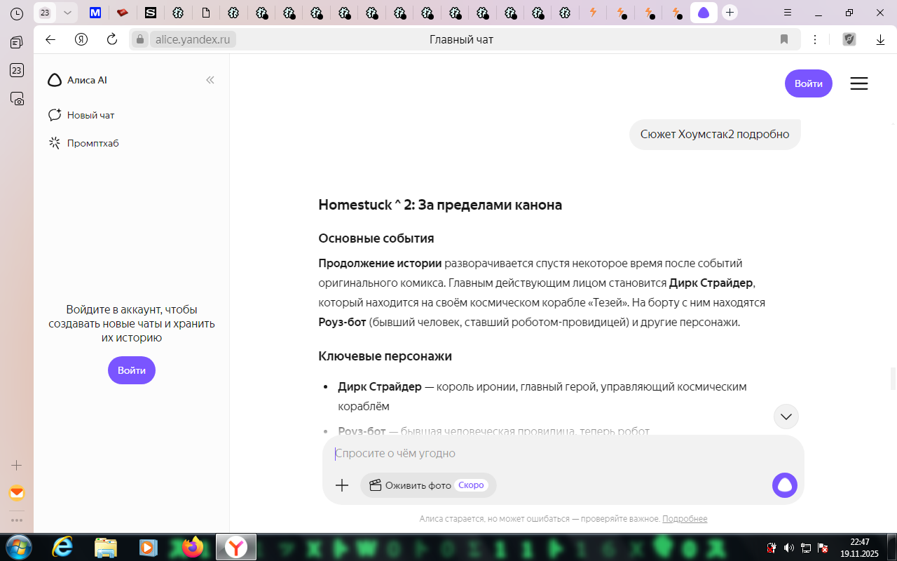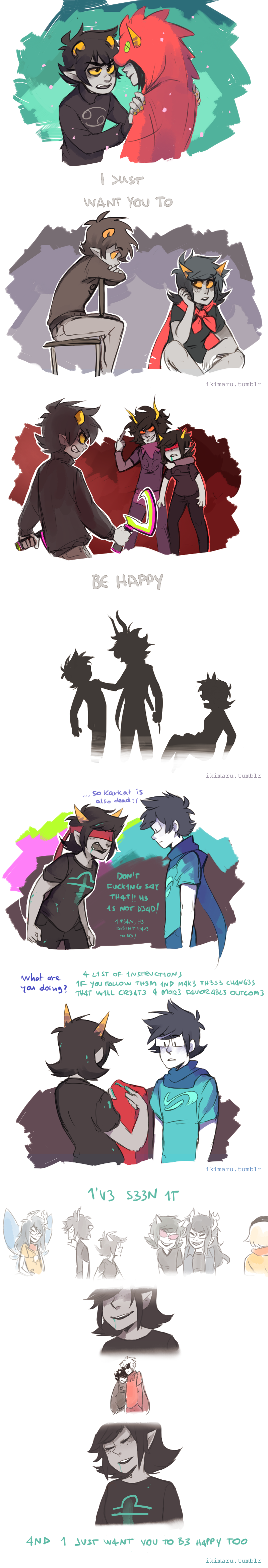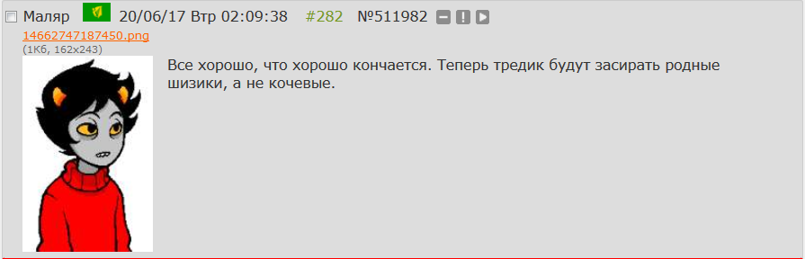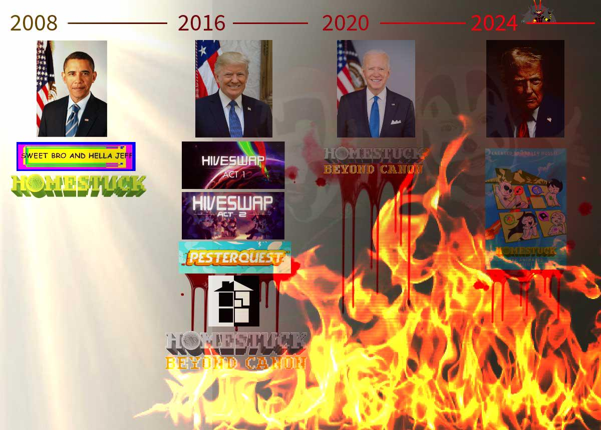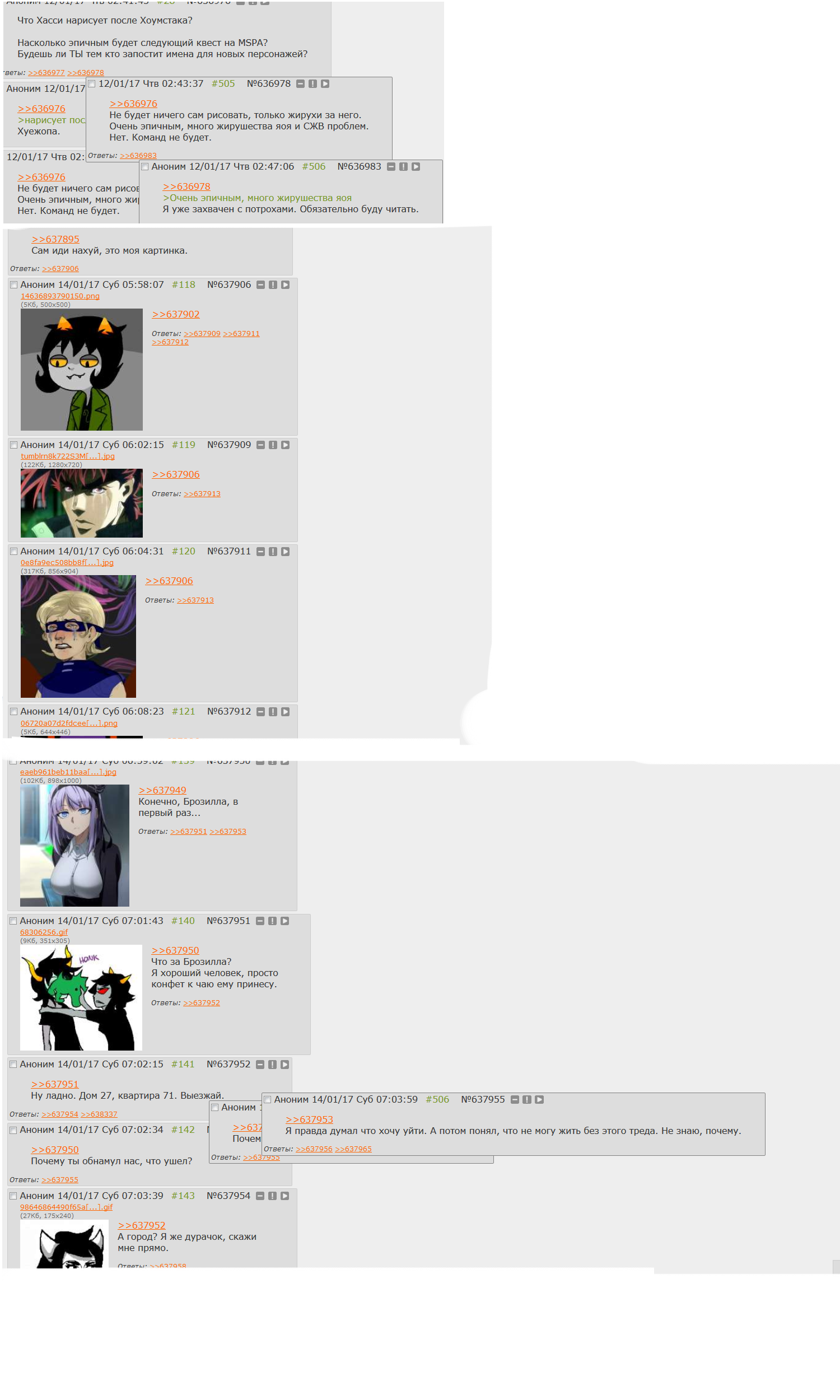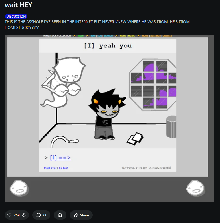 Я читаю потихоньку, по списочку от Jailbreak'а, Problem Sleuth, теперь вот homestuck. Собираюсь вернуться, последний раз немного осенью читал прошлого года. Пришел сюда естественно с дыртейла. Интересно наблюдать за итак нишевой хуйней, так теперь ещё мертвой. У меня эти тролли вызывают чувство дежавю, я их будто уже когда-то где то видел. Странная хуйня, так ещё и никому, блять, уже не нужная кроме как олдам, нёрдам, и чаще всего фанам андертейла.