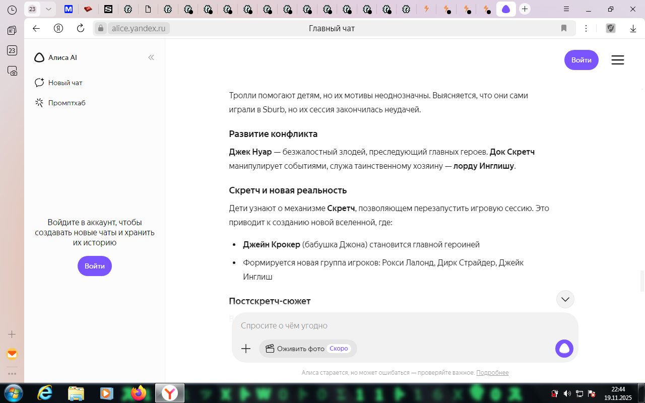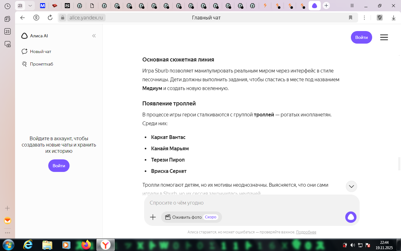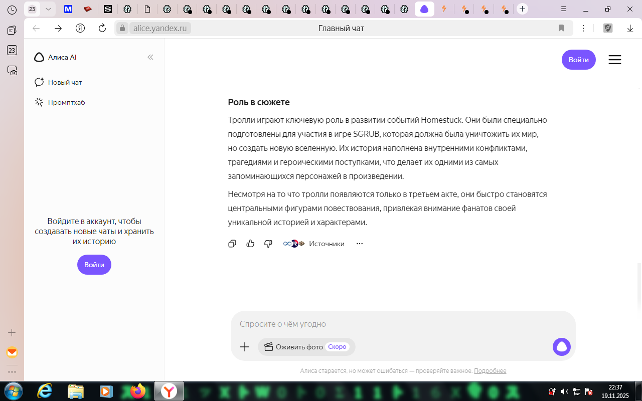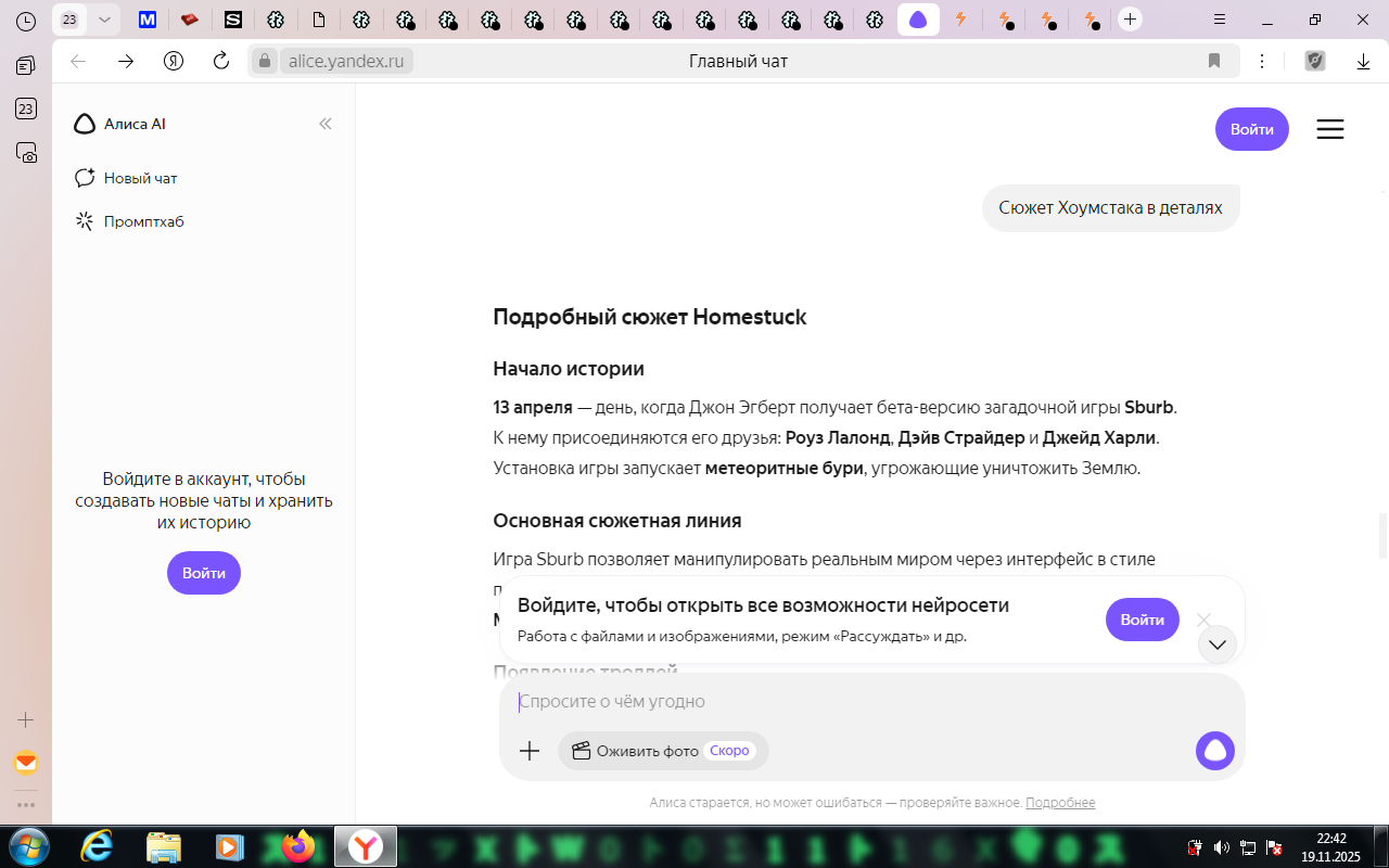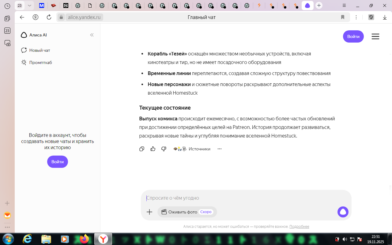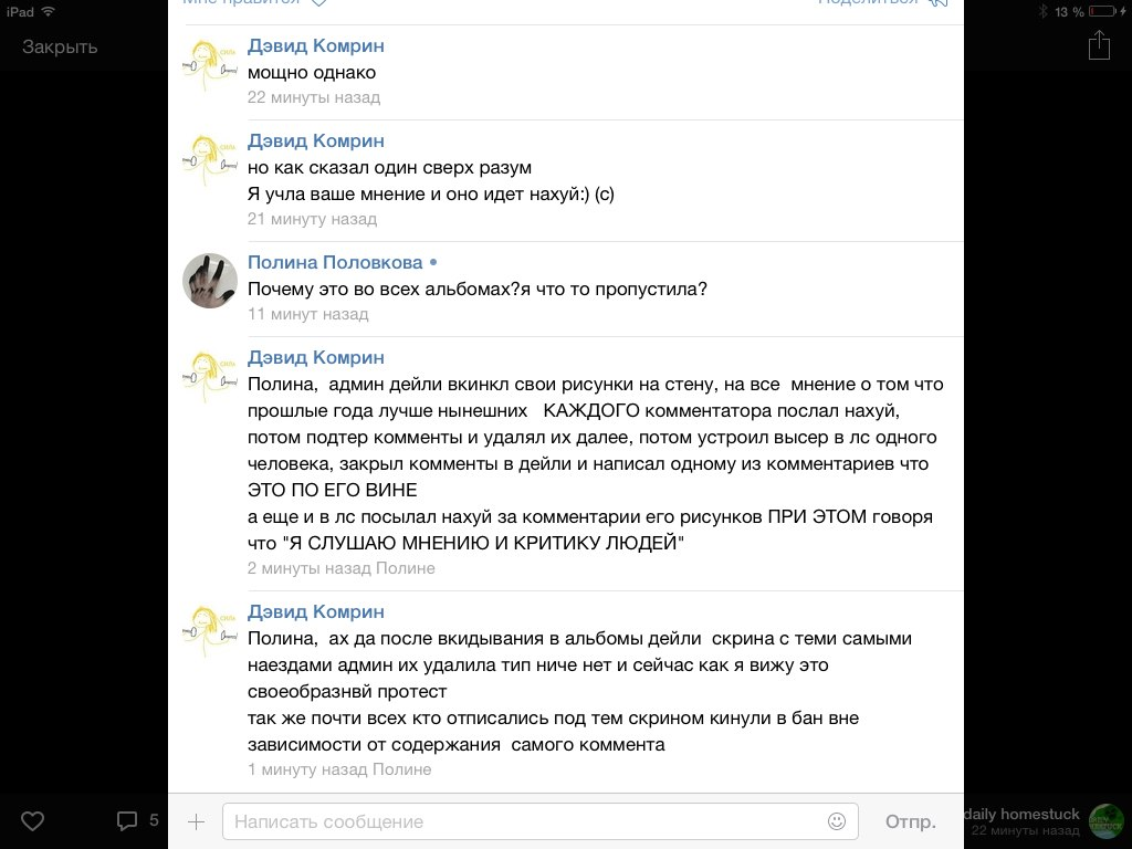 Я читаю потихоньку, по списочку от Jailbreak'а, Problem Sleuth, теперь вот homestuck. Собираюсь вернуться, последний раз немного осенью читал прошлого года. Пришел сюда естественно с дыртейла. Интересно наблюдать за итак нишевой хуйней, так теперь ещё мертвой. У меня эти тролли вызывают чувство дежавю, я их будто уже когда-то где то видел. Странная хуйня, так ещё и никому, блять, уже не нужная кроме как олдам, нёрдам, и чаще всего фанам андертейла.
