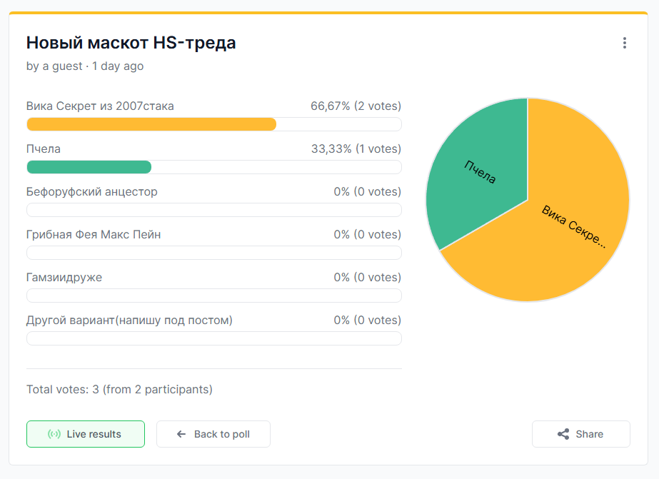 Заебись животворящий маскот как тред оживил! Даже комикс обсуждать стали. А толи будет, когда его выберем! Голосовалку запилил! Ну сейчас выберем!!! Заживём!!! https://strawpoll.com/GJn44zApXnz Варианты голосов: Пчела Бефоруфский анцестор Грибная Фея Макс Пейн Вика Секрет из 2007стака Гамзиидруже Другой вариант(напишу под постом)