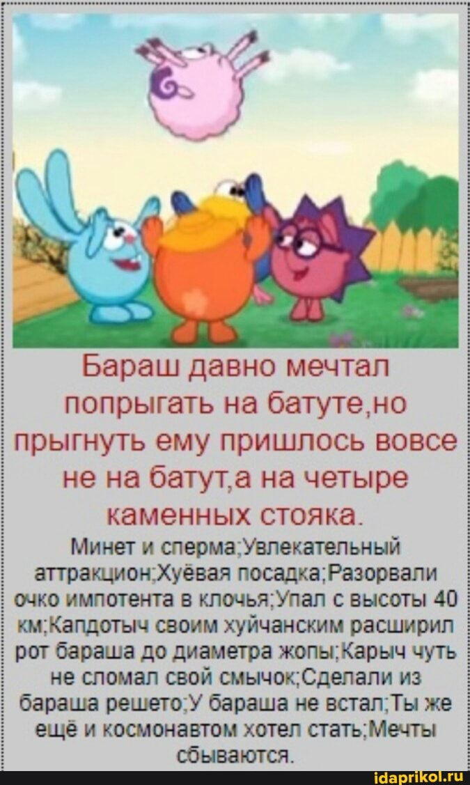 - КАК ЖЕ ВЫ МЕНЯ ЗАЕБАЛИ, СУКИ, ПОЙДУ В ЗЛОВО ГЕНИЯ ИГРАТЬ, СУКА, БЛЯДЬ! – Проорал разраженный клоун, идя по треду. - Эквина тебя ебать будет, а не мы! - ответили на его пост аноны. Последние несколько дней Гамзишизику трудно жилось. Шиппинговый рог трапства довлел над ним. Всеми силами клоун пытался скрыть свою к ней влюблённость. Но, это было так же бесполезно, как пытаться скрыть стояк на нудистском пляже. - Иди разрабатывать своё клоунское дупло! И смазки больше используй. – Дельный совет – подумал Гамзишизик, покраснев от стыда. Он никогда не видел, что же у Эквины в штанах, но используя богатую фантазию, додумал ей большой конский член, а после зафорсил эту обернувшеюся против него идею. – Вот скажу, что у неё конская елда, которая не поместиться в мою дырку, тогда они от меня отстанут, и не будут травить! Перестали ли его травить? Его и не травили на самом деле. Кто-то был слишком чувствительным и параноидальным. Ему казалось, что все смеются над его чувствами к Эквине и злорадствуют ехидно хохоча. Автор, блядь, будь ты проклят! – от злости Гамзишик решил пнуть пол, но пнул, лежащего под его ногами, Тавбро. – ой! ой! ой! не клеюсь я! – закричал мелкобуквенный. - Заебатый друже, как дела? - шизик говорит, что я ко всем клеюсь - Нахуй Шизика, друже. - а давай роллеплей устроим? – Тавбро попытался ухватить Гамзишиза за задницу, но не доставал, лёжа на полу своими мелкими ручками. - Ага, пошли ко мне соку въебём и заебатый роллеплей устроим! Будешь мне троллесамок отыгрывать! - а можно и сейчас. – Тавброс встал с пола, и прошептал на ушко Гамзишизу, мацая его – я твоя меу-лин. это не гейство, если я отыграю роллеплейный смут с тобой, мы же сосредоточились на персонажах – Тавбро положил руку Гамзишизику на свой тощий зад. - Заебись, друже. Гамзишизик нажал на сосок Мелкобуквенному и таким образом вызвал лифт домой.