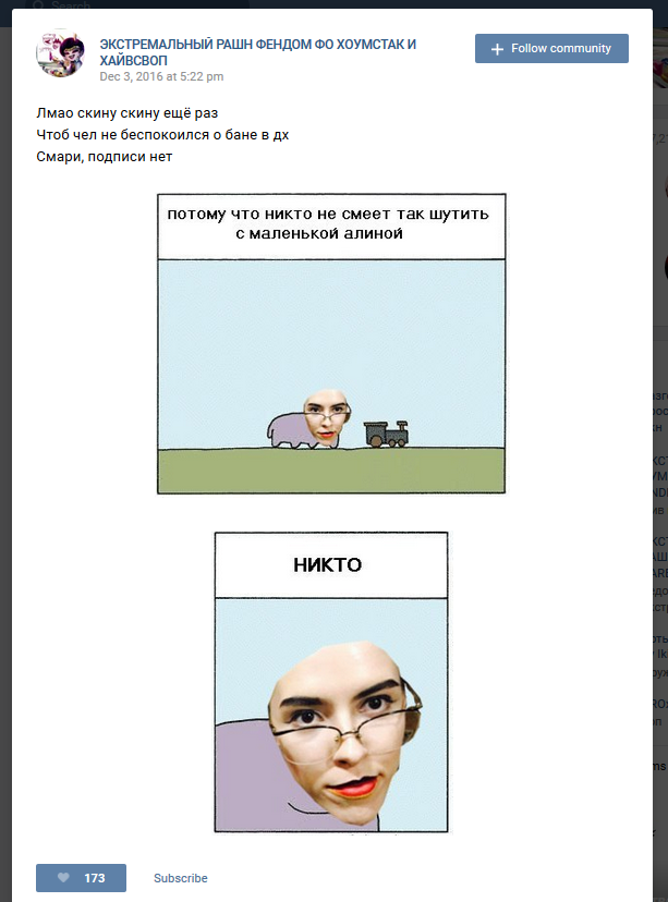 >Как оно вообще было в те времена? Каков был фандом? Не знаю, я не был в фандомах никаих, только картинки с тумблера и двача качал и в треде сидел. Тред,кстати, в самые пиковые дваче-хоумстачные периоды занимал собой с перекатами наверное с треть комиксача >Правда на западе это была хайповая хуйня по типу сегодняшних хайповых темок, или даже тогда это был андерграунд для нёрдов? Там всегда было всего больше, потмоу что и автор оттуда, оттсылки оттуда и про местную культуру, мышление, колорит и т.д. + Хасс там активно пиарился, интервьил, мерч выпускал и т.д. Не зря же он за панели с фантроллями, введёнными в канон тупа на 2 однопанельные страницы сюжетного времени, вместе с продажей и набором денег на не помню что, сорвал за пару дней с донатов куш более сотни лямом долларов Это было больше явление в мемосфере ихнего интернета, и нашего, в меньшей степени, но тоже