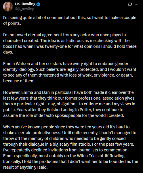 >>1372713 Попытались закэнселлить, но не особо получилось. Недавно она сама нанесла ответный удар и нормально так проехалась по актрисульке, сыгрввшей Гермиону в фильмах и принимавшей участие в кэнселлинге.
