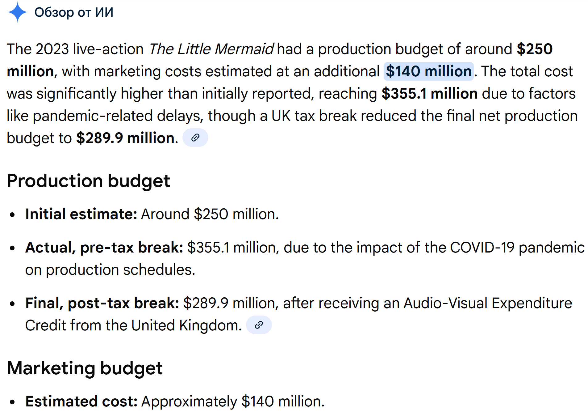 >>1376555 У тебя устаревшие данные, 240 млн - это первоначальная офф. информация от Дриснея, сильно заниженная. Микки не был бы Микки, если б он не пиздел нонстопом про свои финансы. Реальная цифра сильно выше - 290 млн после налогового вычета от съёмок в Британии. Стандартная практика в кинобизнесе для определения коммерческой успешности фильма - сборы x2 от бюджета. Афрорусалка собрала 570 млн за всё время проката, а для условной окупаемости нужно было собрать 580 млн. И это мы ещё не говорим про бюджет на рекламу, где дополнительные 140 млн просадили. Так что нет, Афрорусалка в итоге провалилась, сколько бы Микки со своими ручными медиасобачонками не пытались доказать обратное.