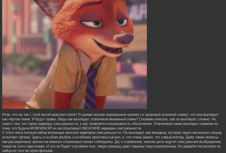 Посмотрел этот ваш зверопил, но не целиком, многое скипнул из за совершенно невыносимого темпа повествования и дерганной картинки. большинство в англоязычном интернете уже писали про проблемы с пейсингом, но тут не просто проблема, а самая настоящая катастрофа. Кадры меняются со скоростью света, сразу видно что делали для детей с СДВГ, перманентно сидящих в тиктоке, это блять просто тяжело воспринимать. Понавводили кучу персонажей, всех раскрыли плохо(а точнее никак), злодей просто самый никчемный червь, я не знаю делал ли Дисней мудака хуже, это даже не уровень овечки из первой части. бобриха очень бесила. Раздражали тупые менты конкуренты. Сюжет тоже абсолютно скомканный и несуразный за счёт своей ужатости. Но он мог бы выглядеть нормально если бы мульт растянули хотя бы на два с половиной часа. В целом это ГОРАЗДО хуже первой части. А если кто пришёл за романсом, то его тут нет. Крольчиха ведёт себя как эгоистичная сука, лезет на рожон, лис ведёт себя точно так же как в начале первого фильма, нихуя не воспринимает всерьез. Но понравилось как он о ней заботится. Короче подойдет тем кто реально фанатит по первой части и примет все косяки. Ну или тем кто кончает с каждого маслонамека на их любимую межвидовую еблю.
