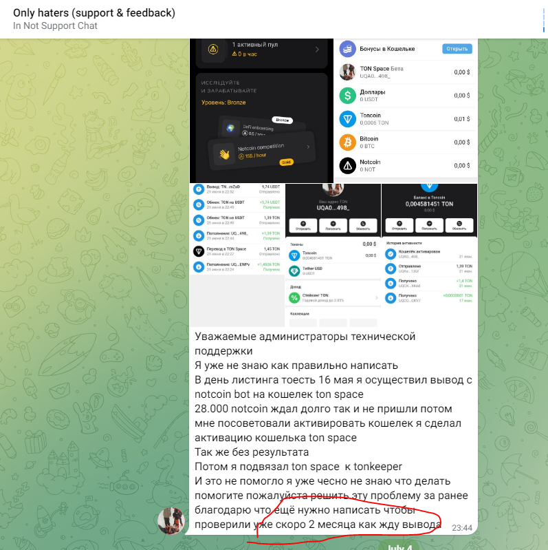 Подскажите, в тг боте у меня баланс Нота, пытался вывести его на привязанный Тонваллет за 300 монет, транза процессинга висела 9 дней, после этого меня бросило с сильвера в бронзу и баланс вернулся на кошелек, теперь вывод неактивен. Есть сеймы и что с этим блять делать?