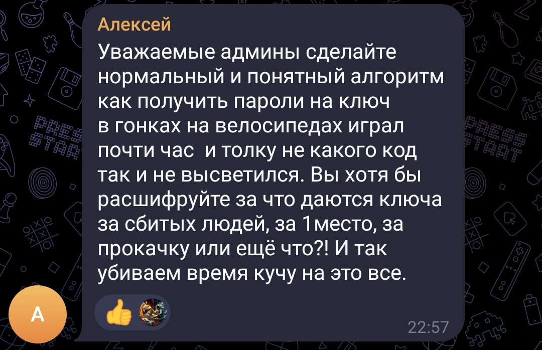 вы понимаете что я не только 4 ключа в кручении педалей должен получить, но и по 4 ключа для 10ти своих фейков которых пригласил, как же я устал играть, а что будет когда введут еше одну игру, ПОЖАЛЕЙТЕ МЕНЯ!!
