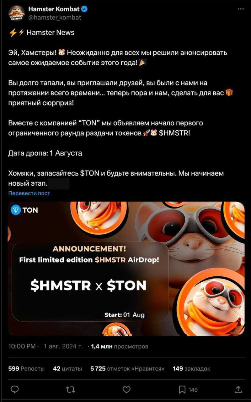1. HMSTRairdrop станет крупнейшим airdrop в истории криптовалют. 2. 60% объема airdrop будет выделено игрокам. Остальная часть зарезервирована для предоставления рыночной ликвидности, экосистемных партнерств и грантов, вознаграждения команд и других целей. 3. Разработка игры будет продолжаться, и для игроков будет доступен второй сезон. Проект планирует запускать обновления для удержания текущих игроков и привлечения новых. 4. Больше игроков означает большую капитализацию, что также означает больший airdrop для каждого игрока. 5. Поскольку Hamster Kombat не поддерживают ни инвестиционные компании, ни венчурные капиталисты, нет дополнительного давления на продажу. Токен управляется сообществом, и его стоимость будет определяться спросом, предложением и интересами сообщества. 6. Раздача токенов Hamster — технически сложная задача, беспрецедентная в мире блокчейна. Разработчики не устанавливают конкретные даты по одной простой причине: невозможно предсказать точные сроки внедрения этого решения. Команда неустанно работает в сотрудничестве с экосистемой TON, чтобы обеспечить плавную и бесперебойную раздачу для всех пользователей.