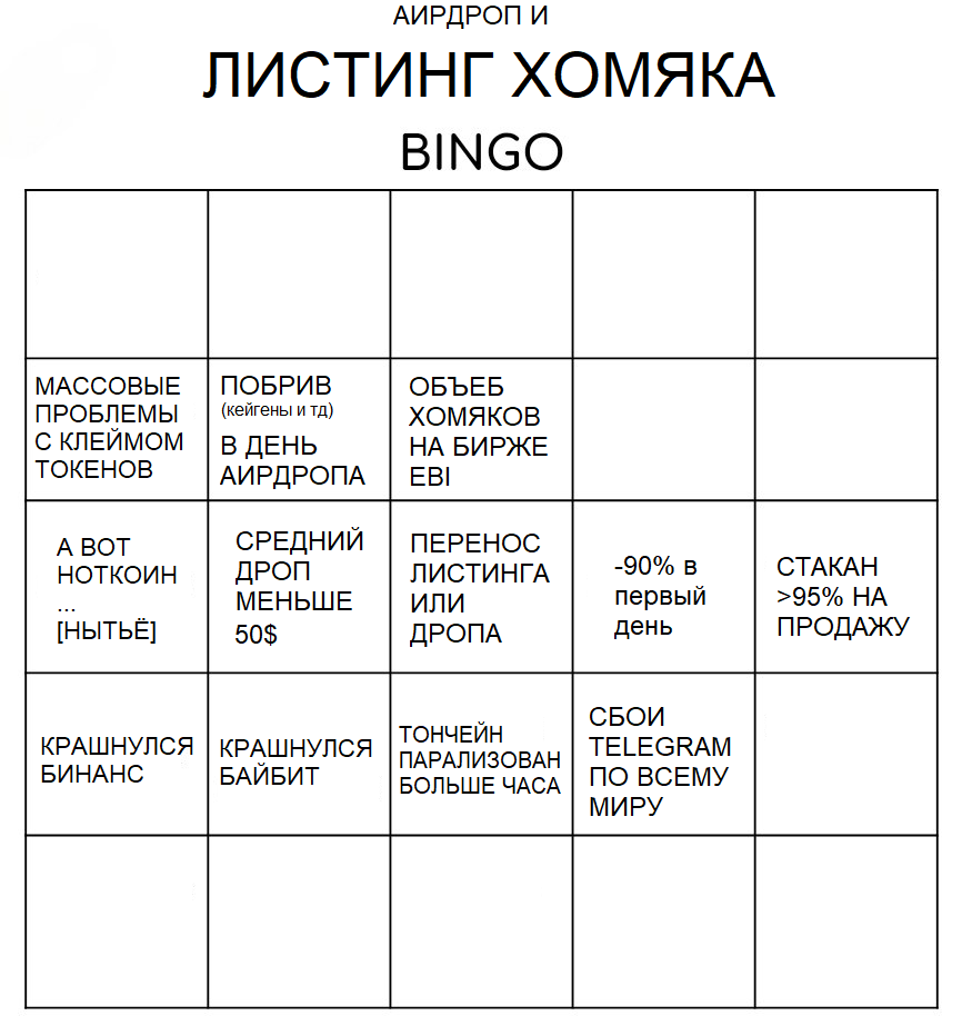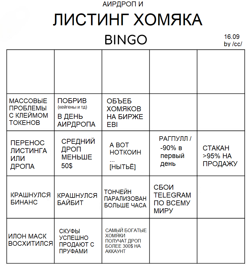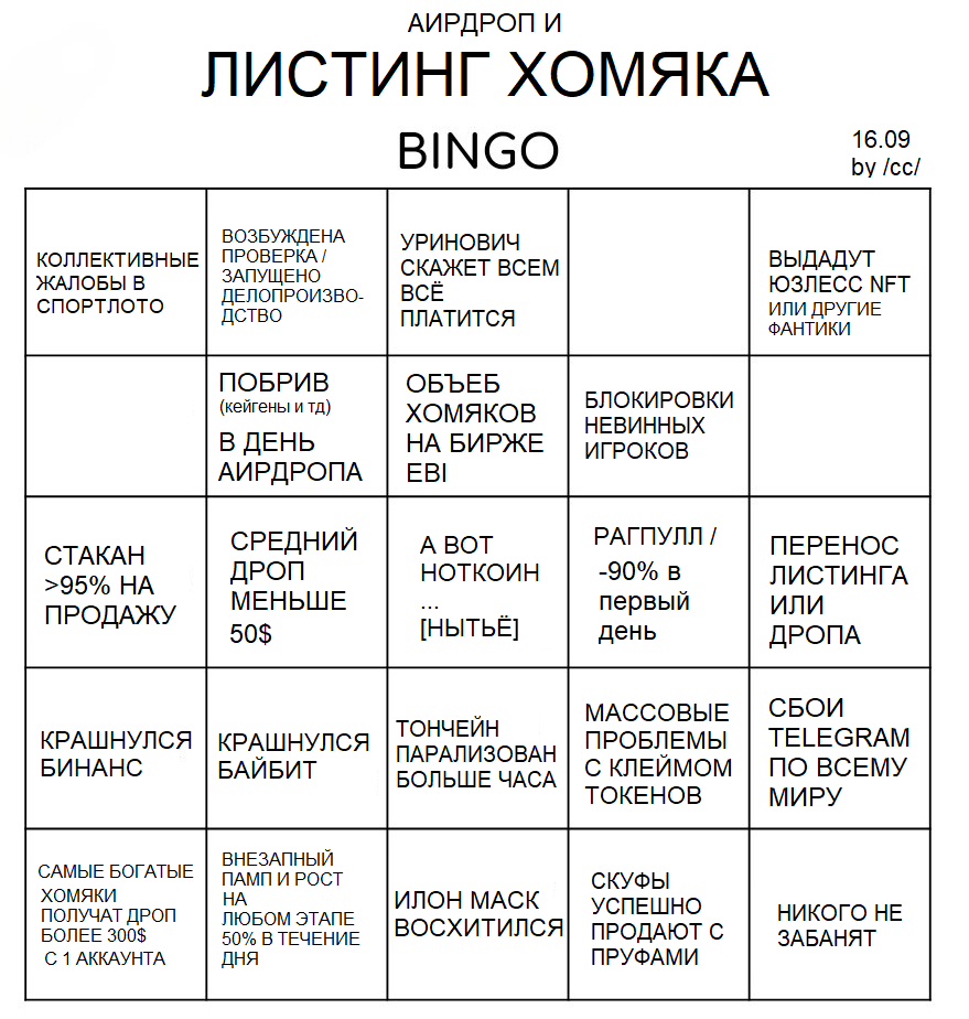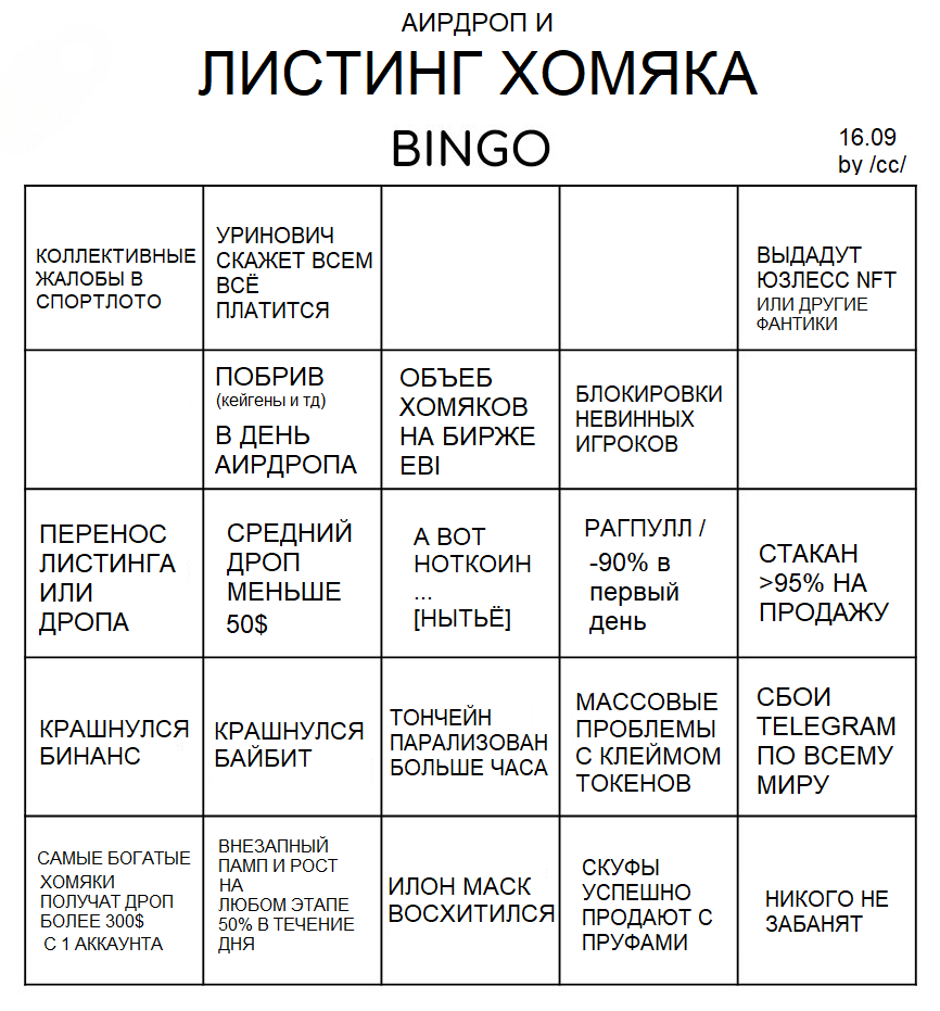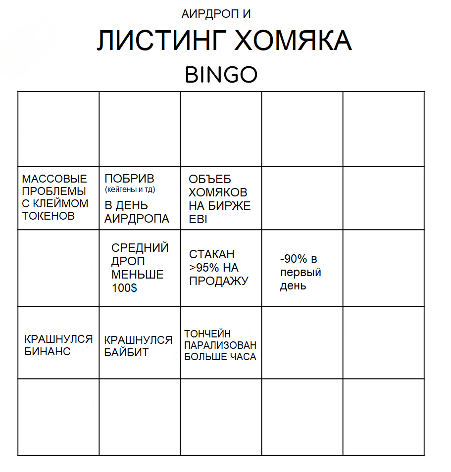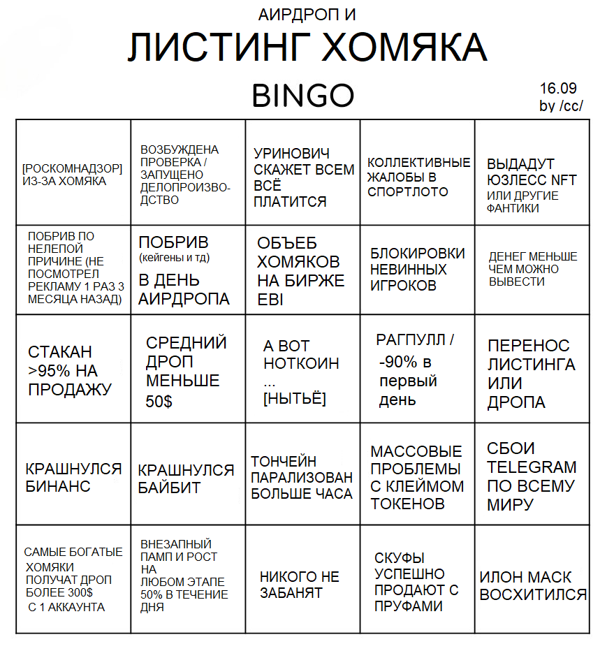 Думаю не я один запас попкорн, поэтом предлагаю запилить двачебинго, чтобы наблюдать за суетой было интереснее. Предлагайте свои пункты, какие события/сюжетные повороты мы ждём от хомяка