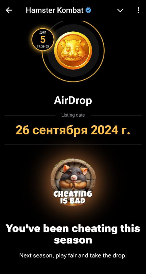 🤓 Мы ввели стратегию против читерства в Hamster Kombat, и некоторые из вас могут получить сегодня достижение «Читерство - это плохо»...
