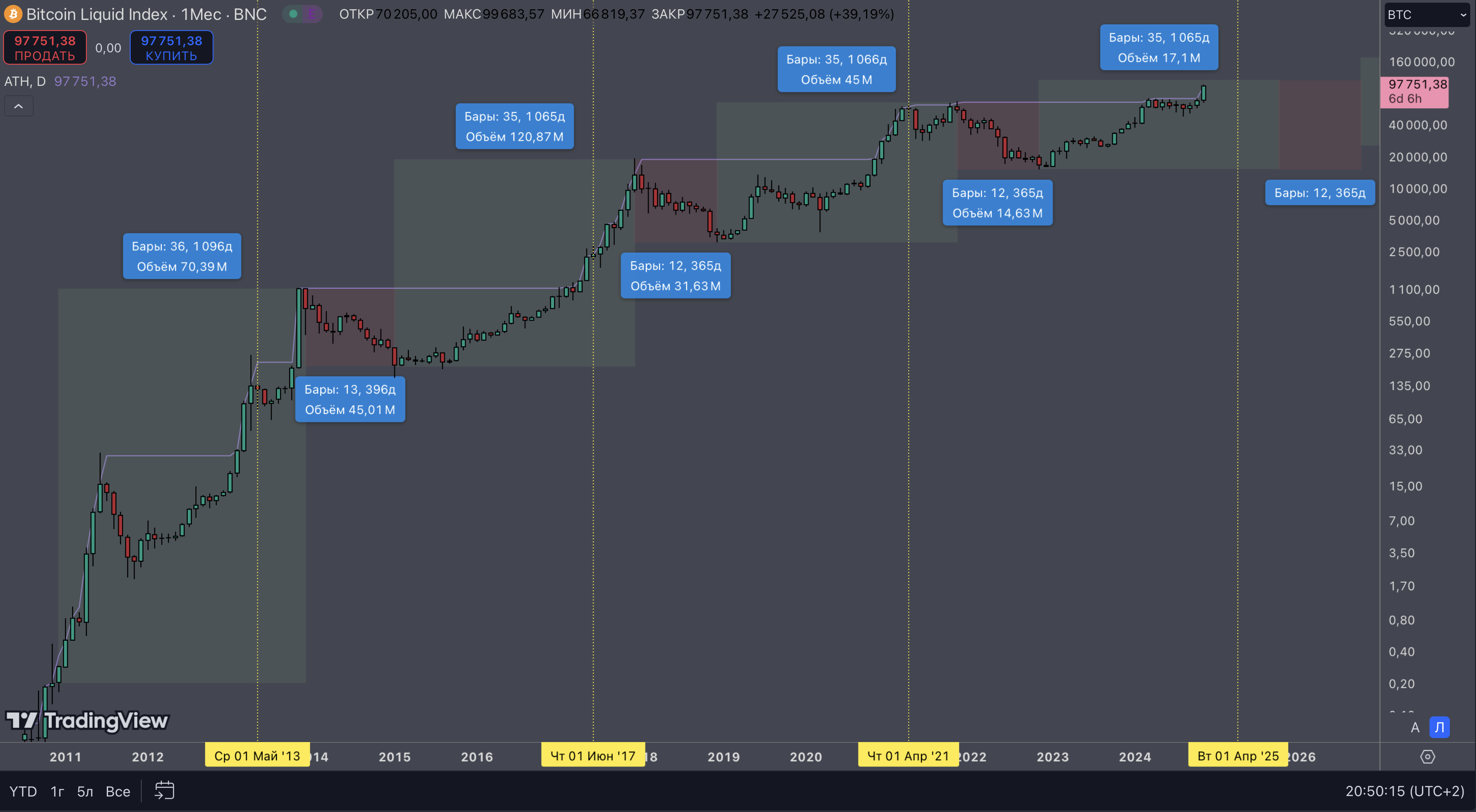 >>1164255 Да пох, если честно, как в ближайшее время будет ходить цена, если весной в любом случае будут иксы. Вообще ниже недельного ТФ опускать не вижу смысла, что при закуп_очке, что при продажах. Закупать-продавать, в принципе, вообще на месячных свечах планирую в следующем цикле. Как видно на скрине, в апреле-июне месячная свеча всегда либо додж рисует, либо небольшая красная, вот на такой свече я и фиксану половинку портфеля, так как почти всегда за этим следует коррекция по битку и, соотвественно, альте.
