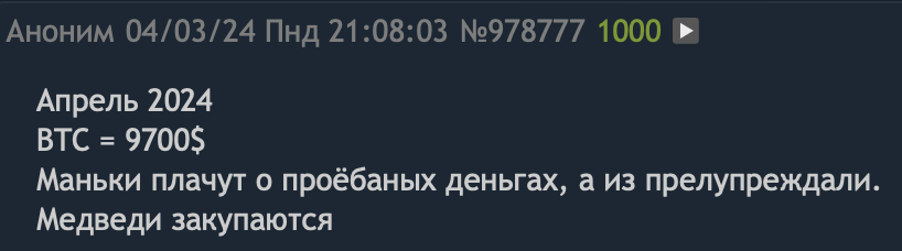 >>1165991 Мелкие коррекции я не могу ванговать, это обычная волатильность. До ноября 2025 дед будет расти, существует вариант мощной коррекции более 20% на 2-3 месяца летом, как это было в прошлом цикле из-за новостного фона от инсектоидов уёбищных.
