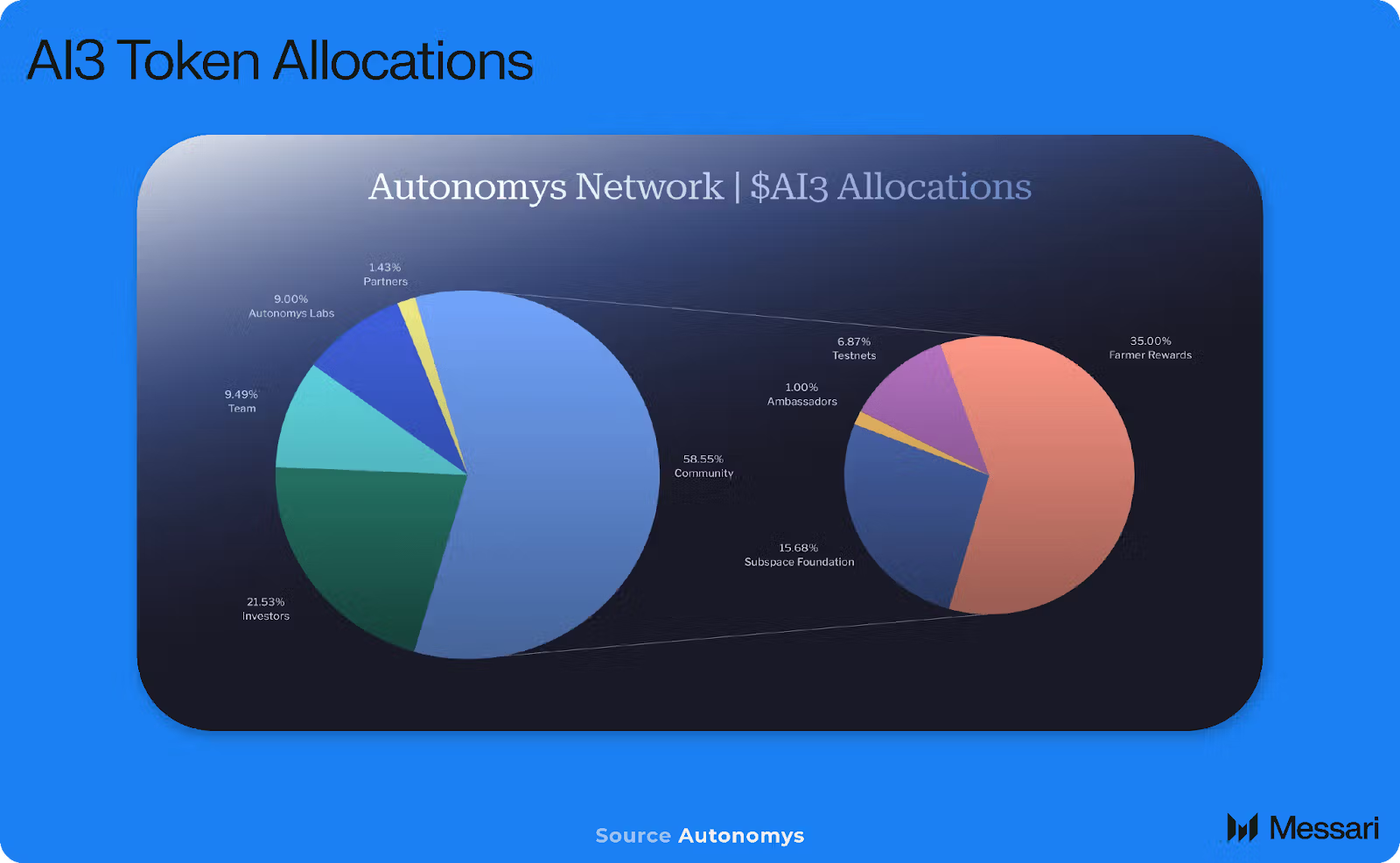 Тотал суплай - 1 миллиард монет. 65% монет - фонды, команда, тестнеты - из них четвертая часть( 155М ) будут разлочены сразу в первом квартале 2025 и сразу ливнут в рынок, остальное на вестинги. 35% монет для баткаков с жужжащими на балконах кудахтерами, вымайнивать эти гроши супплая будут 40 лет. Подробная токеномика: https://messari.io/report/understanding-autonomys-network-a-comprehensive-overview