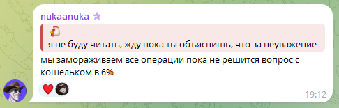 >что такое следование плану ты не слышал Тут извини, я не знал что пиздеть вчера "замораживаем все транзакции до выхода 6% кита", а сегодня "киты это норма" это следование плану.