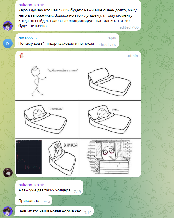 >Они чуть больше половины слили, остальное до сих пор лежит на их кошельках Хуя (2), это не даймонд хенд наверное, но сильно, учитывая какие американские горки были. Ну это хорошо что много еще оставили держать, есть мотивация пампить как планировалось да новых хаев.
