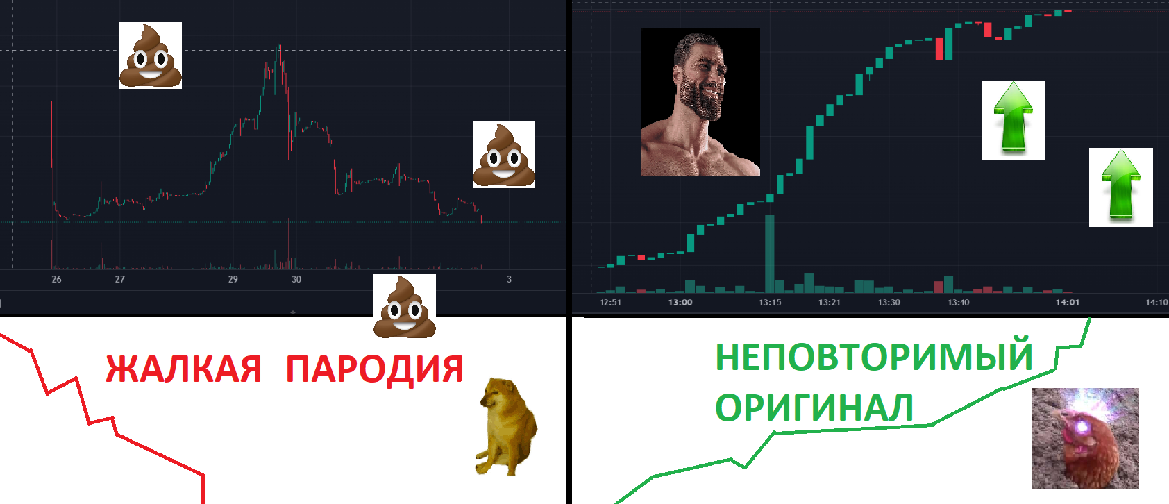 У людей память короткая. В лучшем случае он пойдет по тому же графику что у нас. И без организации он сдохнет. Тогда вопрос с какой целью вы вкладываетесь в голову? Если вы за развитие мемы головы то идете в оригинальную. А если просто монетки покидать туда сюда, то в общем-то без разницы. Я вас уверяю той головой никто не будет заниматься. И то что он запустил новый токен с головой лишь доказывает что наш проект интересен даже хейтерам