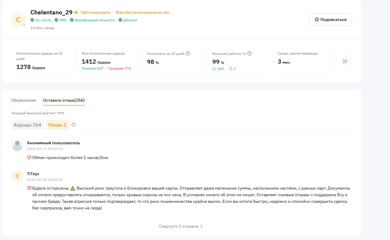 На P2P твои заявки также треуголятся, отзывы могут быть фейковые, статистика не спасет от залива грязи. Покупать ещё как-то можно, продавать - сомнительно.