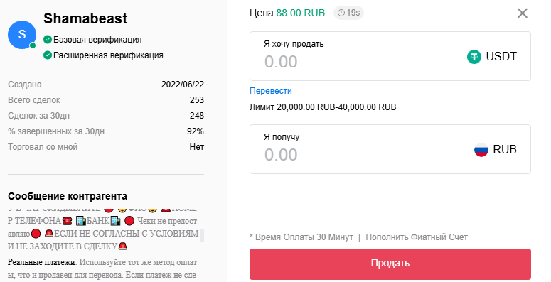 - обязательный верифицированный мерчант Ваш формат торговли несет определенные риски платформы, нужно стать верифицированным мерчантом и заморозить 500 юсдт для торговли в рамках такого метода Подробная инструкция (https://t.me/HuobiCISP2Pannouncement/72)