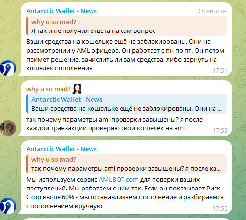 Просто они сами себе выдумывают причины: 60% от Risk Level кошелька или 0.1% по желаемой метке. >АМЛ - это выдумка мошеннических обменников с целью оправдать отъем денег у хомяков Конкретно эти, отсылают обратно на кошелек. У них первый кошелек транзитный, последний скорее всего на бирже, поэтому они боятся чтобы им не заблокировали средства. У них утилити рабочая, не вижу пока смысла в скаме. Непонятно как они антифрод обходят по гео на подтверждение оплаты, хоть это и меньше триггерит чем P2P, если только дроп-банк и дроп-кабинет. Я думаю полгода-год и это закроет ЦБ.