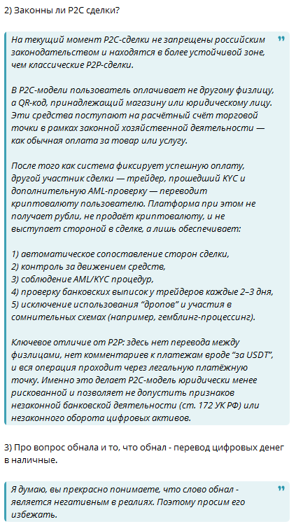 Короче есть два стула. Первый стул это p2p с гавнобирж типо Bybit и все знают что там треугольники, а значит есть риски: 1) блокировки карты по ФЗ 2) угроза со стороны ФСБ и КТ, некоторые переводы опаснее других 3) полная бутылка с налогами