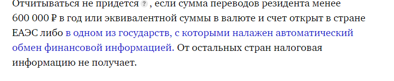 >>1277623 Физическое лицо не представляет налоговым органам отчет о движении денежных средств и иных финансовых активов по своему счету (вкладу), открытому в банке или иной организации финансового рынка, расположенных за пределами территории Российской Федерации, при соблюдении следующих условий:
