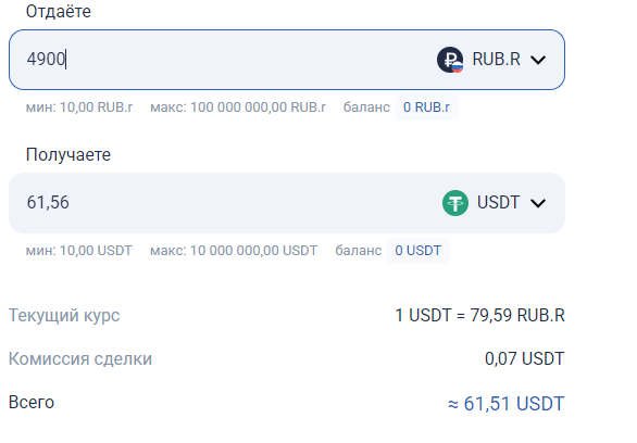 >>1271628 Ок. >>1271629 В следующую шапку закину, гуд. --- Там надо сначала им USDT продать (сейчас курс 1 USDT = 78.58 + fee 43.44р), потом вывести на Мир с комиссий 50р + 2.5%. Примерно как в antarctic wallet будет сумма получения.