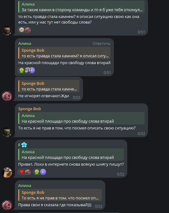 >>1277581 > В группе в телеге негатив трут. Там только хорошее надо писать, напишешь плохое, прибежит АлинОЧКА и Драгон-Дилдо, будут дефать до победного. Токсики на пассивной агрессии, которым бан никогда не выписывают.