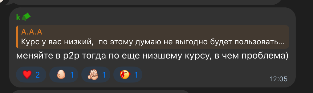 чо ето за чел? в объявлениях пишет, что переводит с личной карты, переводы от третьих лиц не принимает (поэтому курс максимально ублюдский), но его бы захуярили за 3 тыщи переводов с личной карты в месяц, не плюс у него нет ни одного негативного отзывы (точно был один раньше, куда пропал?) и в этих телеграмм группах типа чс байбит его ник по поиску не находится какая-то подозрительная хуйня