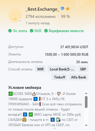 Сделки в основном от 3-лиц: белых треугольщиков и с карт доверенных лиц. Могут разбить платеж в 50к на 5-10 транзакций, поэтому уточняй заранее условия в чате. Сейчас Bybit банит аккаунты за 3-е лицо, процессинг, треугольники и разбитие платежей. На HTX белые треугольники разрешены, разбитие платежей не более 3-х. Есть риск банковских блокировок, 115-ФЗ и 161-ФЗ.