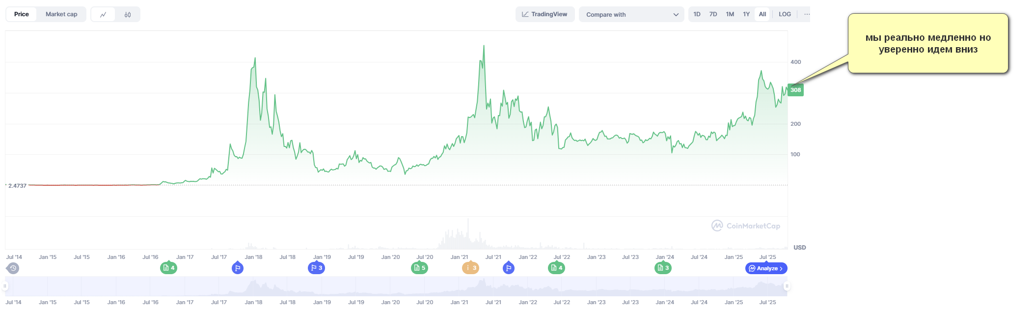 >>1306074 >Лучше дедовского золота купить Там же спред ебейший на покупку-продажу, ещё более дикий, чем в при покупке-продаже крипты. Что бы в 0 выйти надо годами ждать, а ведь ещё инфляция. А ещё можно вложиться в хайповый токен, типа каспы и получить х0,3. А в монере стабильные х2-х3 где бы не купил с 21 года. Иксы с каждым годом будут всё меньше. Чем больше капа, тем сложнее расти же. Может и будут пики до 1000, но я думаю за ближайшие 10 лет так и будет болтаться 300-600. Время хайпа крипты проходит, хомяки засажены, новых хомяков мало, курс нечем пампить. Будет только применение. Для чего монеро и создавалась.