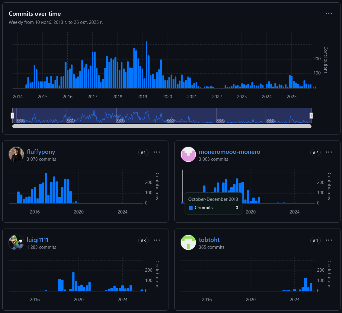 >>1308241 Если посмотреть стату то как раз видно что все основные девы забили хуй на проект ещё в 2020 github.com/monero-project/monero/graphs/contributors
