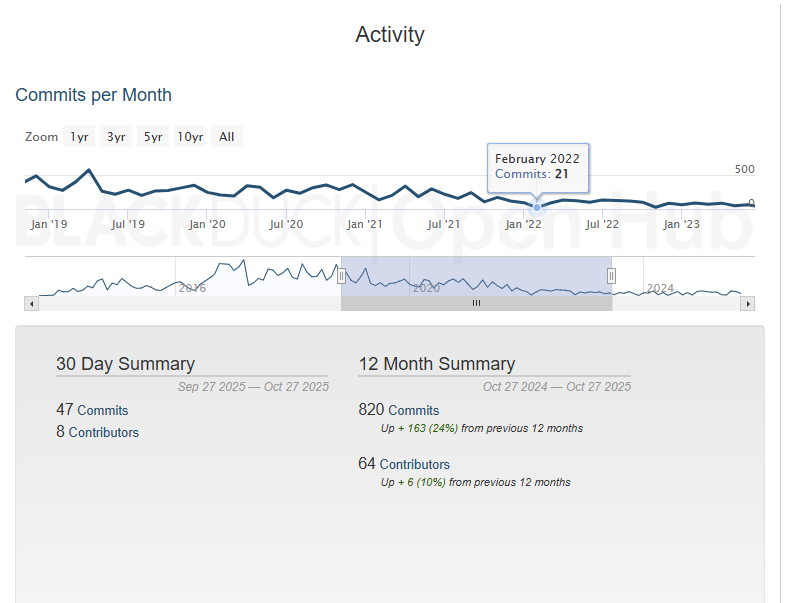 >>1308243 Может надо ещё другие репозитории смотреть? На твоём чарте например видно, что 0 коммитов в январе 2022, но по факту это не так, их 21. Учись пользоваться https://openhub.net/p/moneroэта ссылочка есть в ОП-посте, если что