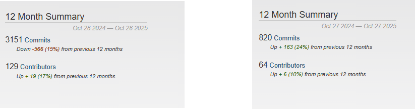 >>1308252 А я считаю, что хорошо идёт разработка монеро. Одно время 2016-2018 была даже более бурная разработка, чем у битка. Сейчас тоже, для такого проекта как монеро, вполне хороший уровень, даже вот если с битком за год сравнить, у битка за год 3151 коммит и 129 разрабов, у монеро 820 коммитов и 64 разраба. Меньше, чем у битка, но и "разрабы забили" это тоже не подходящее определение.