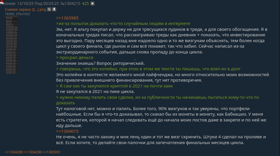 "Антилудоман" шрек постил про безудержный рост альты когда она была около хаев цикла. Значит слиться в минус и уйти в закат он должен был когда альта около лоев цикла. Думаем.