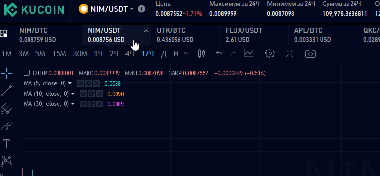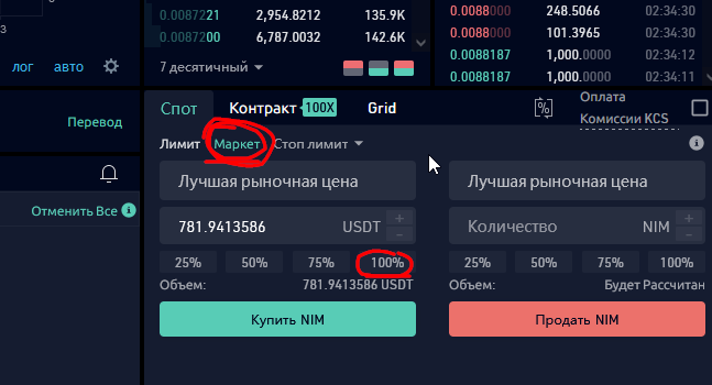 пиздец кукоин этот замороченый, сначала надо будет на спотовую торговлю нажать (скрин1), ну это ладно, потом надо перевести средства на торговый аккаунт (скрин3) - ещё надо будет торговый пароль задать... короче потом тыкаешь на пару NIM/USDT (скрин2) потом покупаешь как на (скрин4) то есть по маркету и на 100%