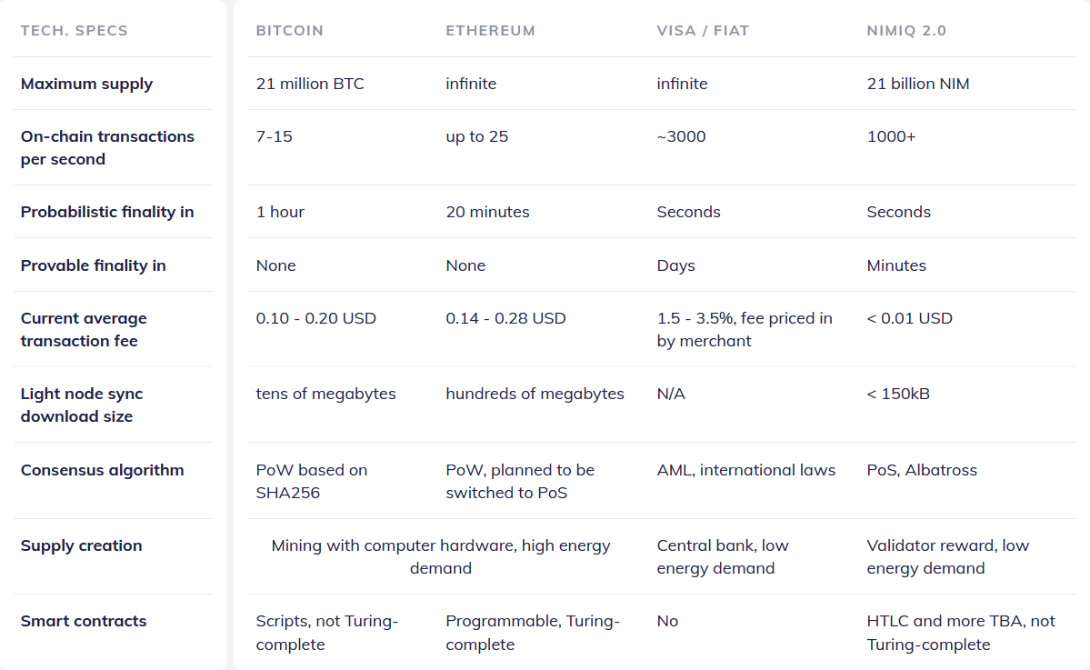 + Тру децентрализованный блокчейн на алгоритме "albatross" (готов на 90%) - ознакомится с характеристиками и поиграться с ним можно здесь (интерактивно - https://www.nimiq.com/albatross/ )
