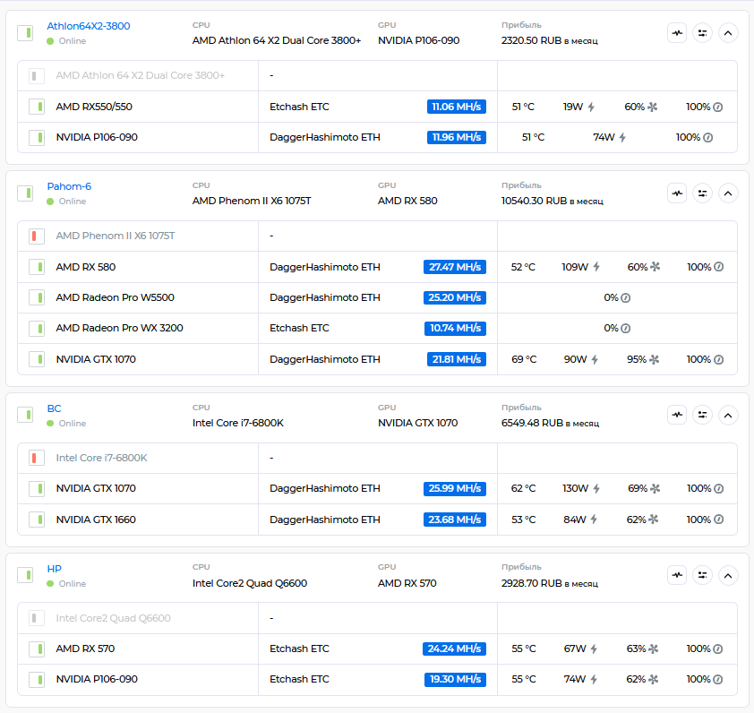 Процессоры (CPU): в основном майнят Monero и Raptoreum, выхлоп так себе. Калькулятор доходности там.