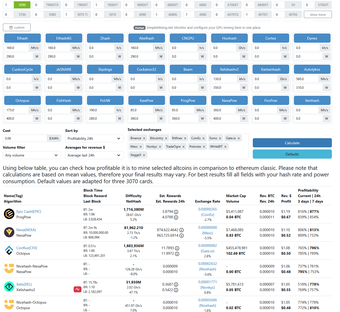 Видеокарты (GPU): множество разных алгоритмов, всё ещё ждут своего часа. Наглядная картина доходности видеокарт на настоящий момент здесь.