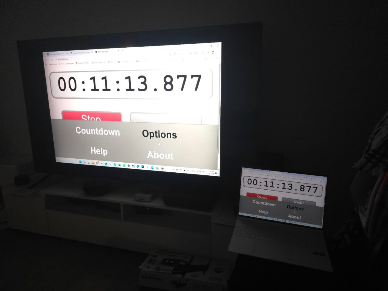 Тестировал тут новую Яндекс ТВ Станцию Про MiniLED (75'') на инпут-лаг. В чём суть теста: подключаешь ноутбук по HDMI, включаешь режим повторения экрана (чтобы на экране ноута и телевизора отображалось одно и то же), и включаешь какой-нибудь таймер с миллисекундами. После чего фоткаешь оба экрана с короткой выдержкой (я фоткал с выдержкой 1/500 секунды) и считаешь, на сколько число миллисекунд на экране ноутбука больше, чем на экране телевизора.