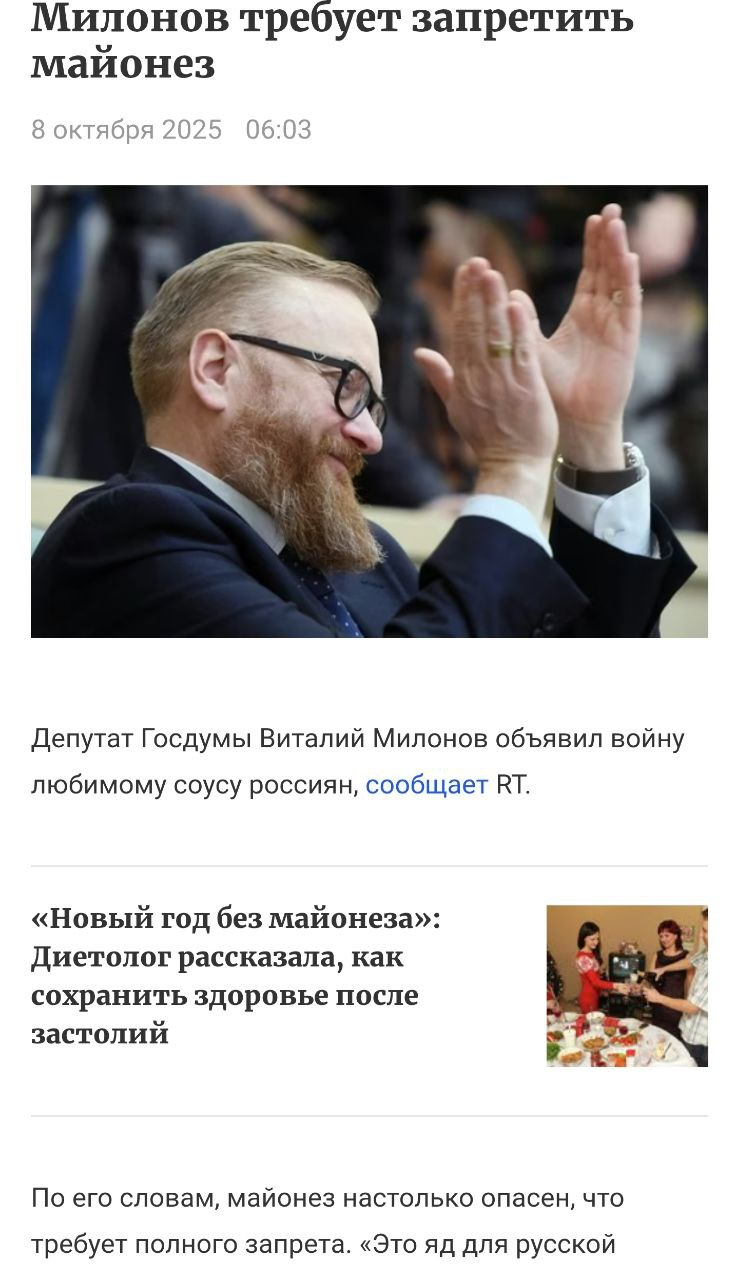 Я считаю, что запрещать майонез, конечно, не стоит (если кто-то хочет добровольно есть эту гадость - его дело), но писать большими буквами на упаковке/в меню что продукт содержит майонез надо обязательно. Никаких "фирменных" соусов или соусов "от шефа", хватит этих нелепых конспираций - пишите прямо и честно, из чего вы делаете вашу еду. Надоело уже читать огромный состав блюд мелким шрифтом.