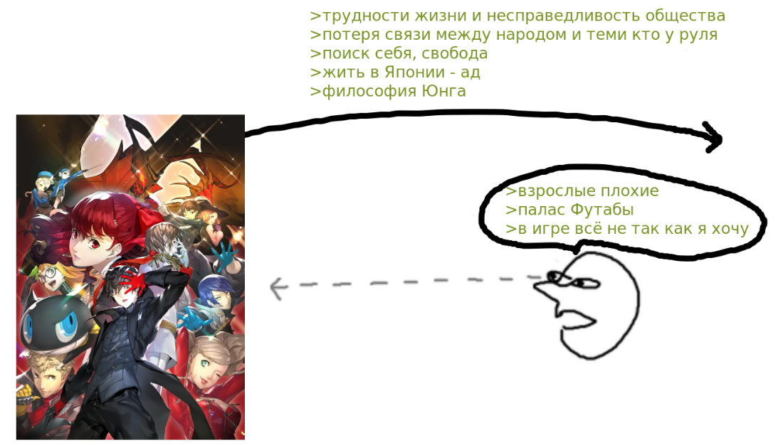 >>2540453 >Я никогда не сидел в персон-тредах и вообще не обсуждал персону ни на дваче, ни в интернете/ДТФ И начинать не стоит. >кроме друзей Это правда для любой игры и вообще всего на свете от машин и аниме до литературы, нет смысла что-то обсуждать с рандомными людьми в интернетах с щитпостами, кривляниями и вахтерством. Для этого есть ирл друзья с похожим или не очень вкусом, всё остальное это рак. Я например аниме и всем японским вообще не интересуюсь, друг чисто случайно дал диск п5роял поиграть, я о серии ни разу не слышал до этого и в жрпг почти не играл а тут колосс 150+ часов, но мне зашло. Да о чем речь вообще если многие от балды игры обсуждают не играя в них, начитались или насмотрелись протыков и как попугаи повторяют, в интернетах кем угодно можно притворяться и что угодно говорить, ценность такой болтовни нулевая. >такого низкого качества нет буквально в миллионых гача-тредах Да везде одинаково. Щас посмотрел, в форчановсков персонатреде щитпостят тяночками из серии как и в любом гача треде. Люди которые реально увлекаются своим хобби играют в игры, смотрят кино и читают книги и мангу вместо постинга на мертвой борде где 3 калеки у которых на всё один ответ "кал". >>2540678 >копиум для скуфов и школьников-омежек. Норм проекции. >Неудачники в этих играх тупо компенсируют отсутствие социализации и любви Ага, вот только исключительно в персоне а не в 99% других игр где ты спасаешь мир и романсишь тяночек. В таком ключе тогда подобные книги и кино тоже для инцелов неудачников выходит, что же ты тут забыл тогда гига-альфа сигма самец. >Япошки на фоне современной изоляции Какой изоляции? Тебя насильно к стулу перед компом никто не прикручивает и в комнате не закрывают на замок. >взрослые тупые не понимают нас таких уникальных и особенных!!!!! Ты в игру вообще играл? Это не тема и не месседж игры, откуда ты и тебе подобные вообще это взяли. Уже который раз замечаю и каждый раз нужно в мем лицом тыкать. Разработчики игры вполне доступно объяснили чем они вдохновлялись и что они хотели сказать. Ну и тема "прошлое поколение не понимает новое поколение" тоже стара как мир, но акцент не на этом.