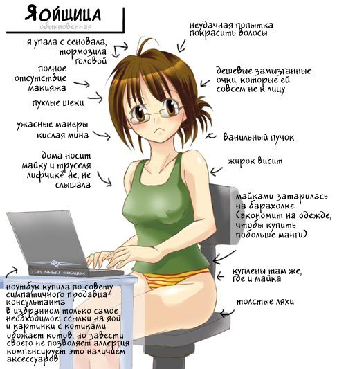 >>2528772 Яойщица (англ. yaoi fangirl, moon. 腐女子 fujoshi, перевести можно как испорченная девушка) — это девушка весьма тургеневского типажа, сильно помешанная на анимешном рисованном гей-порно. Они бывают разной внешности, разных привычек, возраста и порой даже поведения, но зачастую схожи не просто в ветви увлечения, а еще и в непрошибаемом стремлении копаться в отношениях всех тех двух особей мужского пола, которые когда-либо находились рядом; иными словами, фанатичная склонность к слешу. Являются раковой опухолью, убивающей аниме-сообщества, но при этом в среднем пересчете влияют на аниме-индустрию достаточно скромно — если помнить, что аниме уже давно не то, то выясняется, что индустрию убивают некоторые другие заразы.