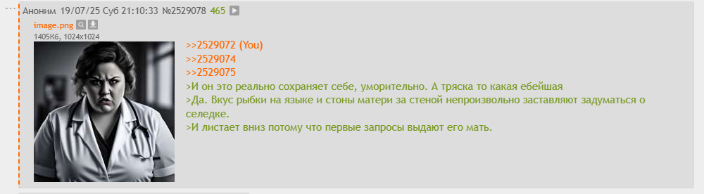 >>2529072 >>2529074 >>2529075 >И он это реально сохраняет себе, уморительно. А тряска то какая ебейшая >Да. Вкус рыбки на языке и стоны матери за стеной непроизвольно заставляют задуматься о селедке. >И листает вниз потому что первые запросы выдают его мать.
