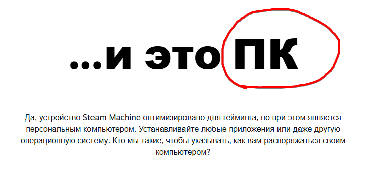 допустим не вышла (хотя почему ей там не выйти?). почему покупатель должен сделать выбор в сторону пк, на котором работает намного меньше игр, вместо пк на котором работает больше игр? Почему человек должен выбрать костыльный стимОС, а не проверенную и привычную винду, на которой гарантировано идут все самые популярные игры сегодняшнего дня?