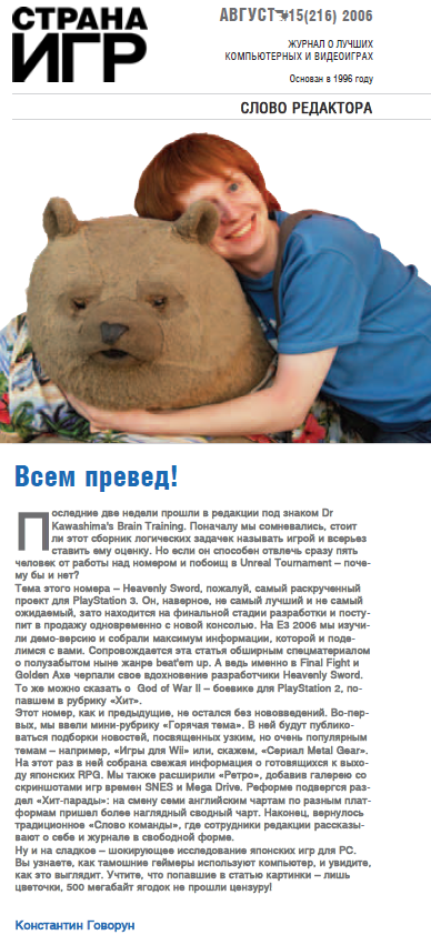Подарили подписку на него в 2004 году, не особо нравился журнал. Самое интересное - рецензии на игры для консолей, ибо у самого была ps2. Но этого добра была максимум 1/5 журнала. Сначала какие-то охуительные новости, на которые было похуй больше чем полностью. Вторая половина - просто говно, обзоры патчей каких-то с диска для всякой писишной параши, ТАКТИКА для олигофренов, причём зачастую всяких до предела линейных игор, киберспорт, аниме, кино, железо, короче всё что нужно в журнале о видеоиграх. На дисках - зачастую параша та ещё, хотя иногда проскакивали интересные переведённые ролики. Короче для меня интереснее было тусоваться в "компьютерном" клубе возле зоны ps2 и в магазинчике видеоигр на рынке, обсуждая игры с компанией таких же геймеров.