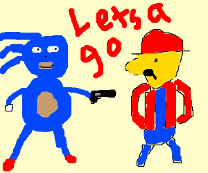 Тейлз встречает странное существо - синее, с иголками, в комбинезоне и кепке... - Ой, ты кто? - Я Марио! Тут к ним подъезжает Эггмобиль, открывается дверца и выходит Эггман, тоже в комбинезоне и кепке. - А ты кто? - Я Марио! - Вы оба Марио? - А мы из разных пиратских игр.